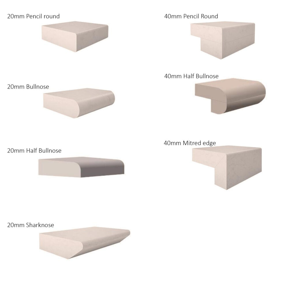 As all stone is cut and polished in the factory at EMG, we can custom cut any edge profile desired by our clients. Below is a sample of the more popular profiles available.